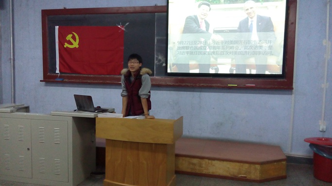 会议开始,主持人首先和大家共同梳理了近期国内外的主要时事热点,并表明本次会议将主要讨论习近平总书记对美英两国进行的国事访问。接着,支部的刘晗、王继超两位同学相继进行了精心准备的ppt发言。刘晗同学主要以习近平总书记的访问行程为线索,概述了访问的重点内容,并就其中一些重要活动发表了自己的见解,精彩独到之处引来支部同学的阵阵掌声。而王继超同学则重点对比了两次访问的不同,例如,从两次访问的意义上来说,访美可以概括为“增信释疑、聚焦合作”,而访英则为“全面推动中英关系发展,开启中英全球全面战略伙伴关系黄金时代”。他从六个方面阐述不同,有理有据,给大家提供了一个很好的参考。