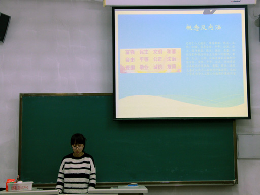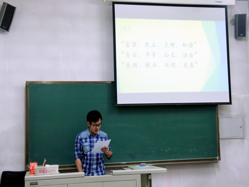 会上,主持人首先介绍了本次讲坛的主题以及开展讲坛的目和意义。接下来由四位学生代表发言,配合提前准备好的讲稿和ppt展示了自己对《当代大学生如何以实际行动践行社会主义核心价值观》的理解与认识。讲坛现场氛围活跃,内容丰富充实,与会同学都受益匪浅。