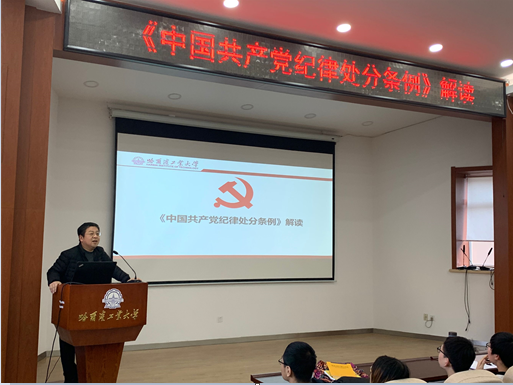 11月15日中午在邵逸夫馆205会议室,中文字幕av 分党校发展对象培训班开展第三次集中培训,学院党委副书记张弛老师以“《中国共产党纪律处分条例》解读”为主题开展专题党课。