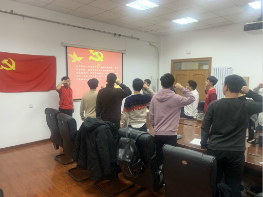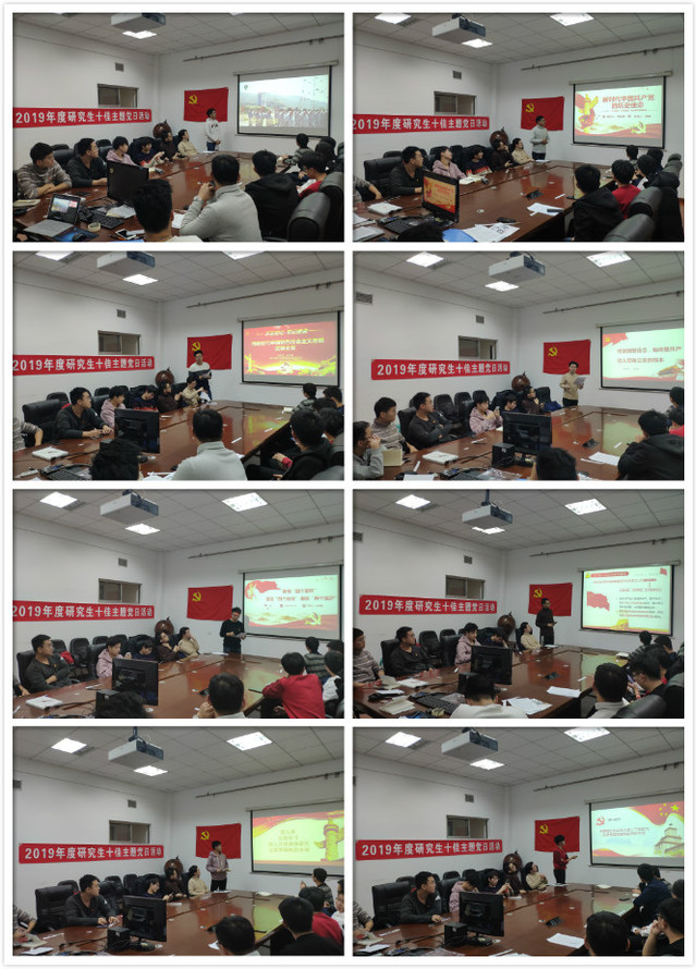 活动开始,党支书撒子成分享了自己对《习近平关于“不忘初心,牢记使命”论述摘编》的学习心得,然后开展微党课大赛,党支部全体21名党员划分10个小组,分别就10个原著章节作主题微党课报告。苏毅同志从中国共产党的成立出发,讲述了党带领人民的奋斗历程,让同学们明确了共产党人的初心与使命,作为学生更应该负担起民族复兴大任,为中国人民谋幸福,为中华民族谋复兴;高守栋同志从习近平总书记对青年的六点要求谈起,阐述了自己对中国共产党人初心和使命的理解;何思贤同志以视频开始,与同学们一起重温了“四个意识”,并结合当代研究生的现况着重阐述了政治意识的重要性。党课结束后,同学们进行投票,选出自己心目中最佳的微党课小讲师。最后党支书撒子成又带领支部全体党员面向党旗进行了宣誓。