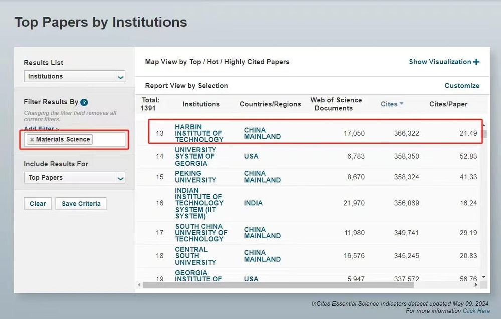 2024年5月9日,哈工大“材料科学”学科成功进入ESI排名前万分之一1‱行列!实现历史性突破!