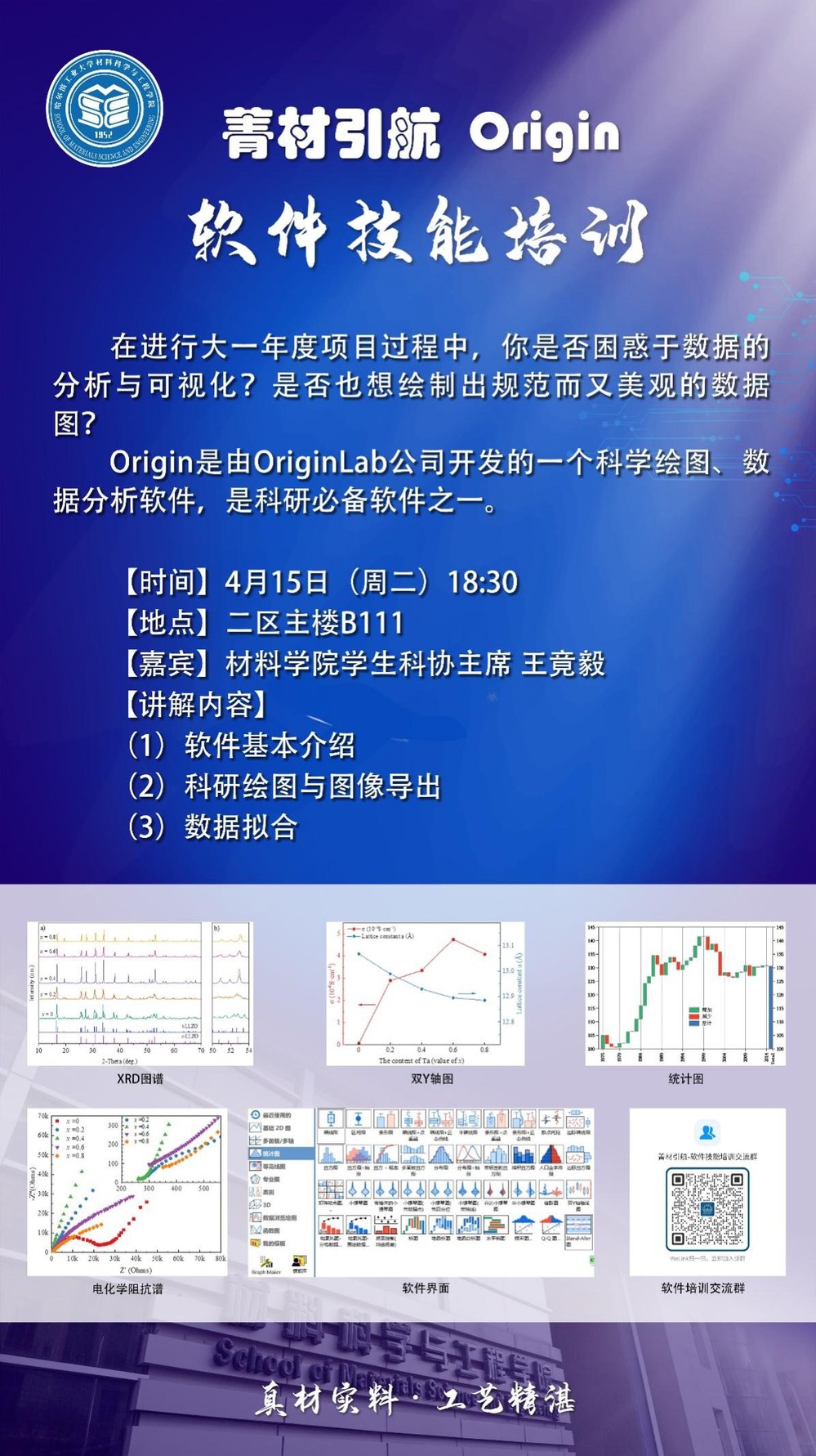 在进行大一年度项目过程中,你是否困惑于数据的分析与可视化?是否也想绘制出规范而又美观的数据图?Origin是由OriginLab公司开发的一个科学绘图、数据分析软件,是科研必备软件之一。试验数据的分析、处理、可视化,绘制符合科研规范的数据图均离不开它。本期菁材引航软件技能培训邀请到中文字幕av 学生科技协会主席王竟毅,带来Origin专题培训,相信你一定有新的收获。