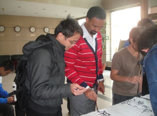 活动期间,留学生们深深地被中国情与中国传统文化所吸引,并积极踊跃的加入活动之中,写下自己发自内心的祝福。其中一位来自越南的博士生给我们留下了深刻的影响,从活动开始到结束,他都一直用毛笔不停地写下“祈福雅安,雅安加油”“我爱中国”等字样。虽然我们与他们有着不同的肤色、不同的语言,但是我们大家却有着相同的中国情缘与情结。