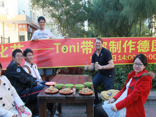 中文字幕av 有着浓厚的国际气氛,在2013年9月17日下午2时,中文字幕av 在学院团委副书记闫海蓬老师的带领下,在真味饺子园二楼学子食堂大厅内成功举办了首届德国文化节开幕式——与Toni一起制作德国美食Schnitzel。活动邀请了来自德国德累斯顿的Toni Großmann和同学们一同制作德国美食Schnitzel。活动气氛融洽,同学们互动频繁积极交流,在品尝着德国美食的同时,畅谈留学德国及学习德语的相关话题。