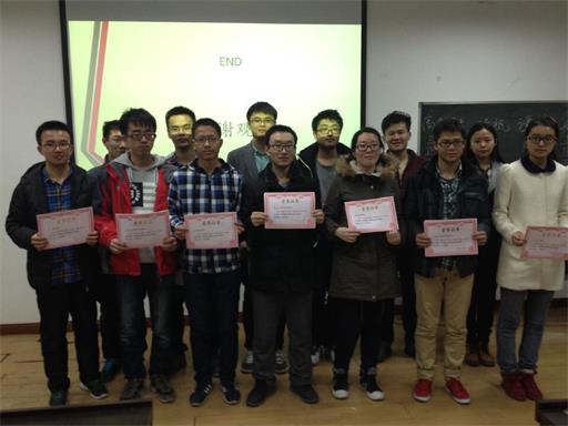 最后,社会实践部部长吴世博给优秀社会实践活动优秀代表颁发奖状,并鼓励大家多多参与,多多学习,同时感谢各位同学分享的宝贵经历。并对获奖人员拍摄留念。