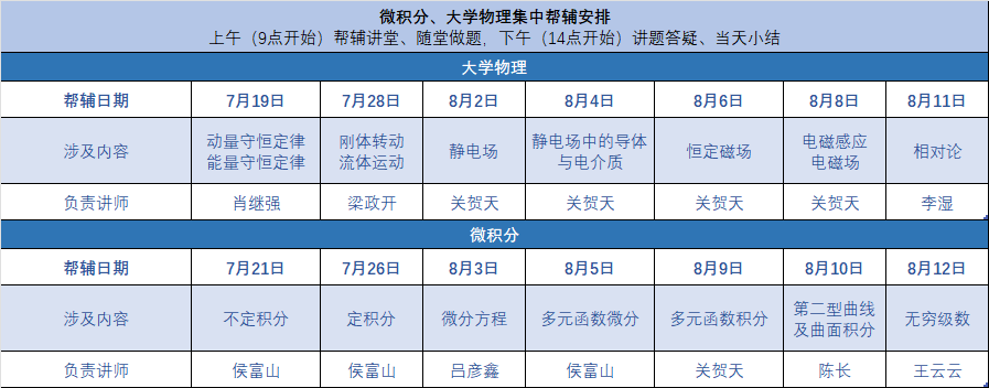 一是保持假期自习答疑不间断,工作室志愿者部每周一到周五分时段组织线上集体自习,相应科目讲师在线答疑,每门重点科目保证每周至少两次线上自习。针对留校的学生,工作室安排留校讲师值班,随时进行线下答疑。二是重点帮辅对象方案个性化,确保假期答疑通道全畅通,工作室讲师紧密与辅导员及科目任课教师联动,监督学生复习进展,每周制定任务清单,视复习状态随时调整帮辅方案。三是重点科目集中多轮次帮辅,从7月19日起,工作室讲师针对微积分、大学物理两门重难点课程,开展多轮次线上帮辅讲堂,在讲解知识点的同时串联真题,梳理备考知识脉络,巩固重要知识点。帮辅讲堂共开展十四次,具体课程安排参见下图。